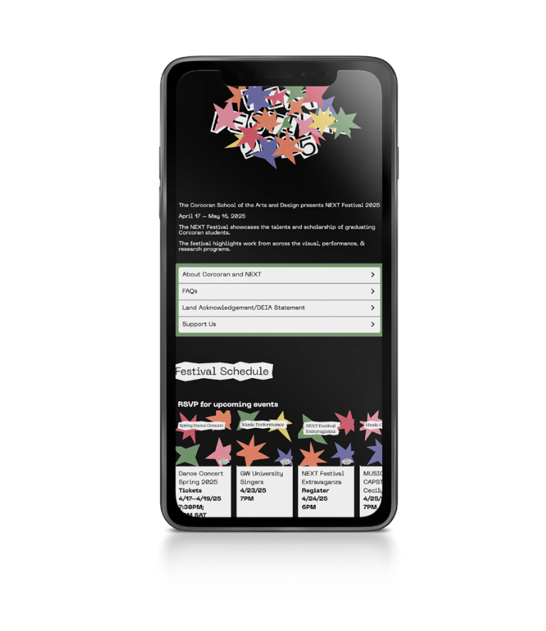NEXT is an exhibition festival showcasing the thesis work of all graduating students, both undergraduate and graduate at the Corcoran School of Art and Design. As a Corcoran Design Lab Fellow, I collaborated with other students and faculty to create the new NEXT25 brand identity and apply it across all media for the exhibition.