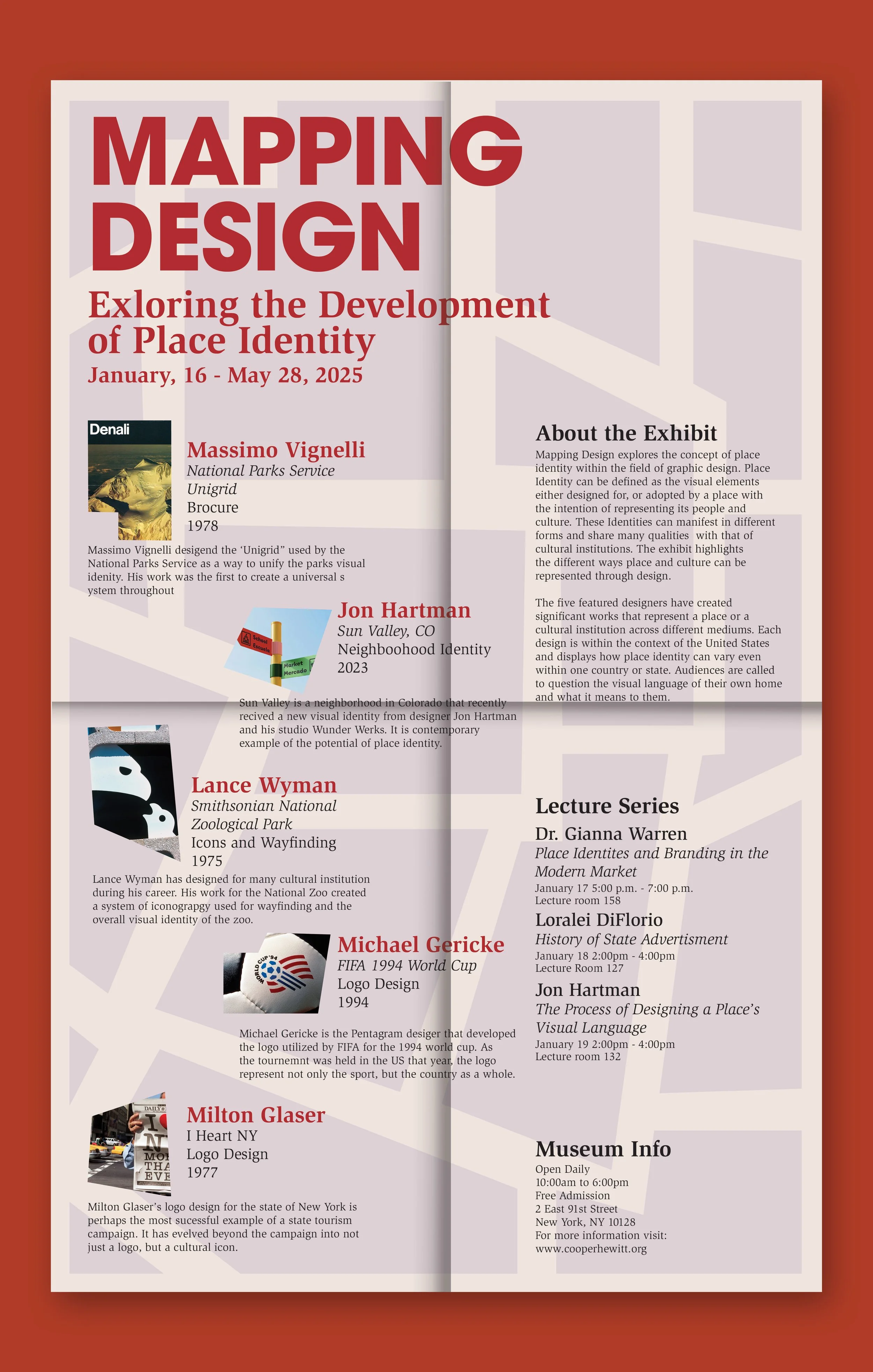 My second project was a hypothetical exhibition and lecture series on the topic of place identity. With this project I was concerned with more contemporary, yet prominent works of place identity. Mapping Design highlights the different forms place identity manifests and their role in design scholarship.